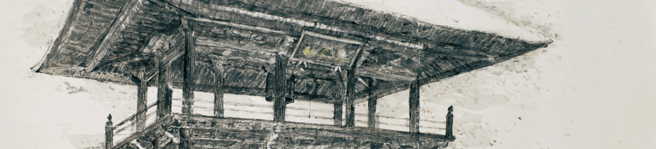山門の迫力が出るよう、淡い墨を数十回と塗り重ねる積墨法を用いた点。