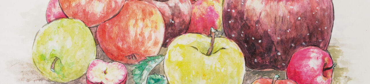 多くのりんごの品種を紹介できるよう、単調にならないようにりんごを描き分けました。