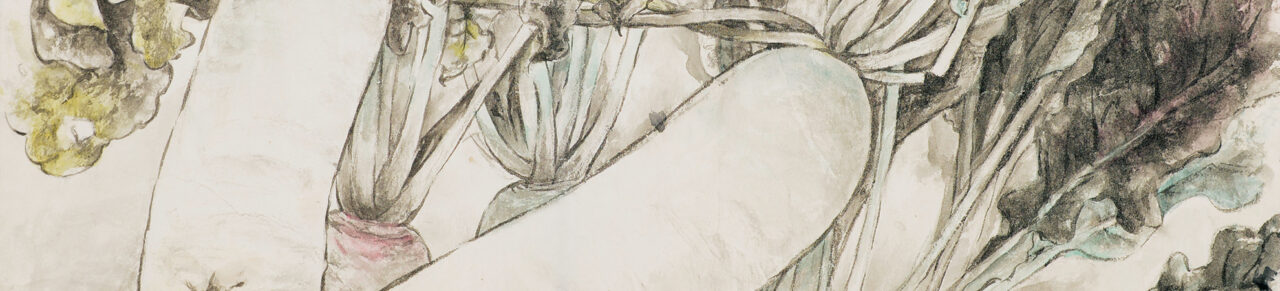 水墨画(南画)家、高森彩雨による大根と野沢菜の墨彩画