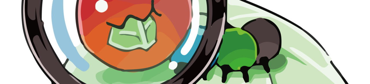 地元の名産(キャベツ)、職業(バグを見つけて3色ボールペンでチェックする)を親しみやすくするため、バグ(虫)をユーモラスに描きました。